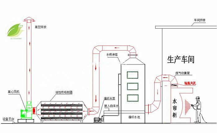 廢氣源→高效吸收塔(吸收掉漆霧、粉塵以及顆粒物)→活性炭吸附塔(吸附部分苯甲苯二甲苯)→→高壓風(fēng)機(高壓的吸力作用下持續(xù)將廢氣抽出車間)→煙囪高空排放(也可低空排放)。