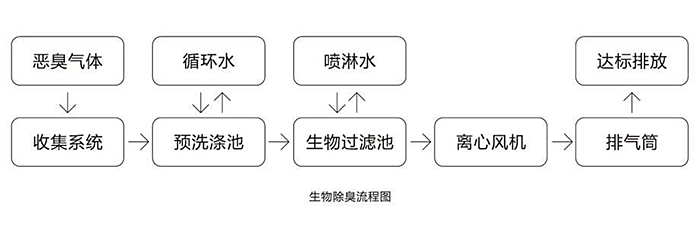 惡臭氣體經(jīng)過(guò)管道收集后進(jìn)入生物過(guò)濾除臭裝置,氣流與循環(huán)液在穿過(guò)生物填料層的過(guò)程中完成生物的氣液擴(kuò)散、液固擴(kuò)散、生物氧化三個(gè)過(guò)程,生物填料表面生物膜中的微生物以惡臭氣體物質(zhì)為營(yíng)養(yǎng),惡臭物及VOCs被微生物氧化分解,在轉(zhuǎn)化過(guò)程中產(chǎn)生能量,為微生物的生長(zhǎng)與繁殖提供能源,使惡臭氣體物質(zhì)的轉(zhuǎn)化持續(xù)進(jìn)行,經(jīng)凈化后的氣體由引風(fēng)機(jī)引出排放。